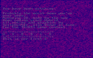 At the time this intro was made, I used Scalphunter as nickname in my Hybrid productions, but I stopped using it after this intro, cause I thought the nick Scalphunter sucked :) This is the only production ever where I use the nick Scalphunter. All code and graphics was done by me, and originally I intended to have MIDI music, using QMIDI, but I didn't, cause the song I made for it was crap, and I didn't have the time for making it fit in timing and such. (I started making the intro just a short time before the deadline)